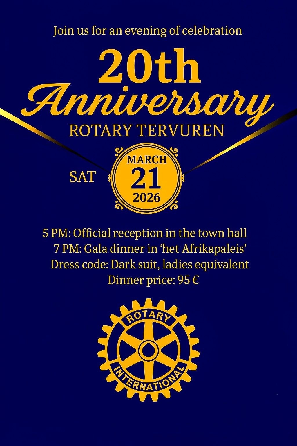 We will celebrate Rotary Club Tervuren's 20 years with our former and current members this weekend! Highlights are a reception in the Town Hall followed by a gala dinner in the Africa Palace on Saturday.